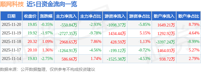 证券之星消息,截至2025年11月20日收盘,顺网科技(300113)报收于19.85元,下跌0.35%,换手率1.81%,成交量9.4万手,成交额1.88亿元。