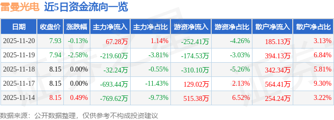 证券之星消息,截至2025年11月20日收盘,雷曼光电(300162)报收于7.93元,下跌0.13%,换手率2.18%,成交量7.46万手,成交额5922.01万元。