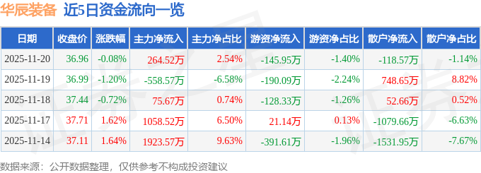 证券之星消息,截至2025年11月20日收盘,华辰装备(300809)报收于36.96元,下跌0.08%,换手率1.86%,成交量2.8万手,成交额1.04亿元。