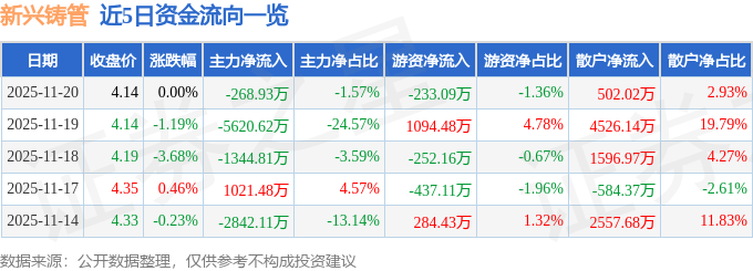 证券之星消息,截至2025年11月20日收盘,新兴铸管(000778)报收于4.14元,上涨0.0%,换手率1.06%,成交量41.2万手,成交额1.71亿元。