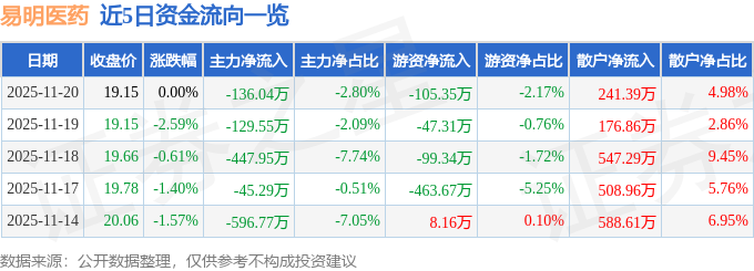 证券之星消息,截至2025年11月20日收盘,易明医药(002826)报收于19.15元,上涨0.0%,换手率1.45%,成交量2.53万手,成交额4850.29万元。