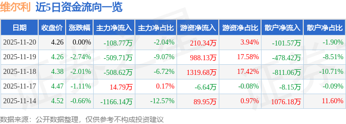 证券之星消息,截至2025年11月20日收盘,维尔利(300190)报收于4.26元,上涨0.0%,换手率1.56%,成交量12.51万手,成交额5336.25万元。