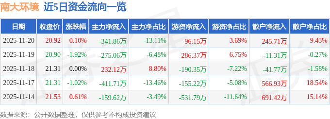 证券之星消息,截至2025年11月20日收盘,南大环境(300864)报收于20.92元,上涨0.1%,换手率0.79%,成交量1.25万手,成交额2606.89万元。