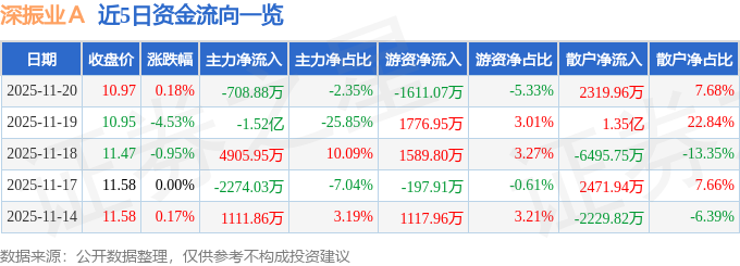 证券之星消息,截至2025年11月20日收盘,深振业A(000006)报收于10.97元,上涨0.18%,换手率2.05%,成交量27.62万手,成交额3.02亿元。