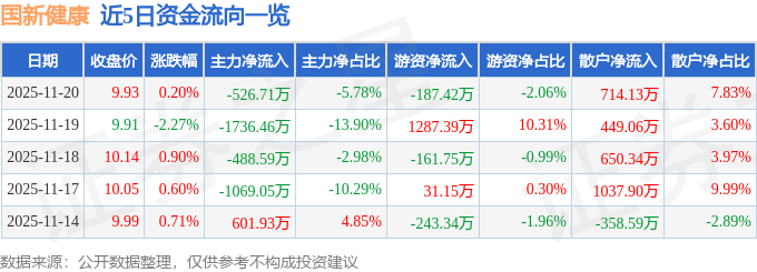 证券之星消息,截至2025年11月20日收盘,国新健康(000503)报收于9.93元,上涨0.2%,换手率0.94%,成交量9.23万手,成交额9117.26万元。