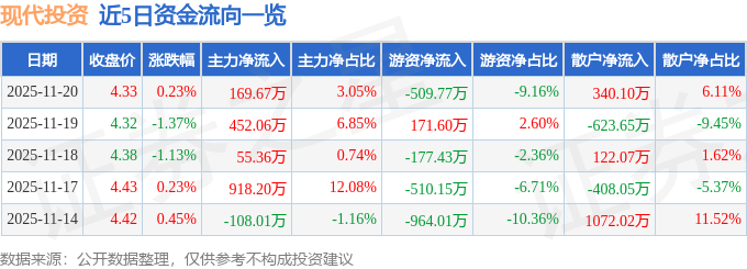 证券之星消息,截至2025年11月20日收盘,现代投资(000900)报收于4.33元,上涨0.23%,换手率0.85%,成交量12.85万手,成交额5567.44万元。