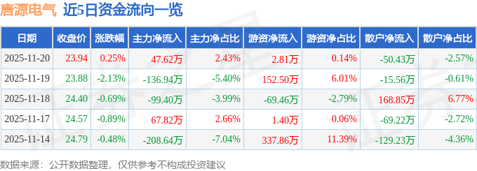 证券之星消息,截至2025年11月20日收盘,唐源电气(300789)报收于23.94元,上涨0.25%,换手率0.83%,成交量8184.0手,成交额1963.02万元。
