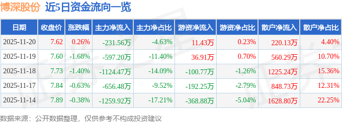 11月20日的资金流向数据方面,主力资金净流出231.56万元,占总成交额4.63%,游资资金净流入11.43万元,占总成交额0.23%,散户资金净流入220.13万元,占总成交额4.4%。