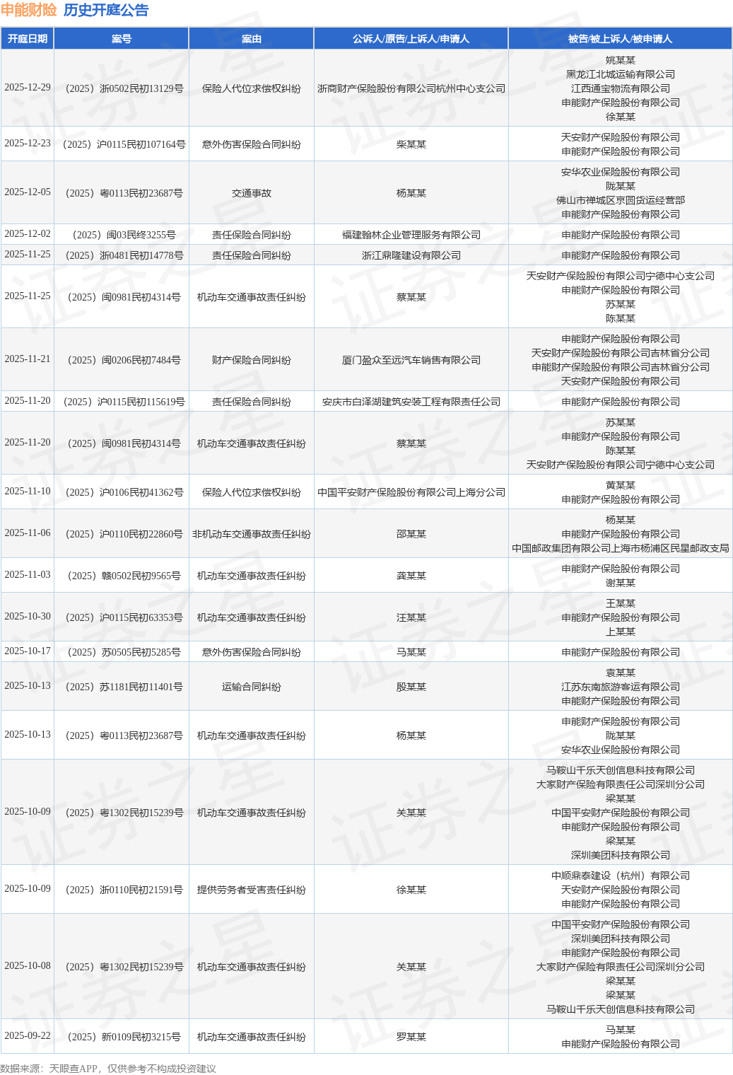 案号:(2025)闽0206民初7484号根据统计,近一年内以申能财产保险股份有限公司为当事人的历史开庭公告有70则,其中案由为“机动车交通事故责任纠纷”的公告以40则居首,其次为“责任保险合同纠纷”有8则,“非机动车交通事故责任纠纷”有5则。历史开庭公告(前20条)如下: