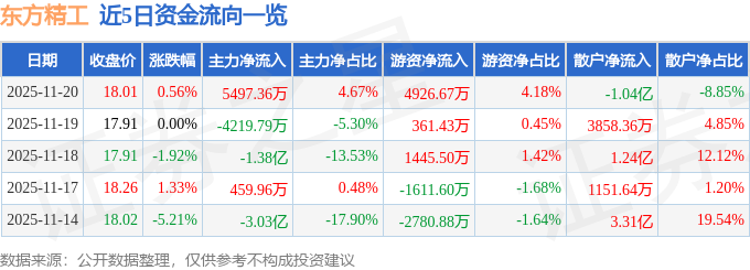 证券之星消息,截至2025年11月20日收盘,东方精工(002611)报收于18.01元,上涨0.56%,换手率6.47%,成交量64.84万手,成交额11.77亿元。