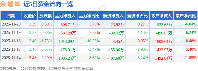 11月20日的资金流向数据方面,主力资金净流入508.71万元,占总成交额5.76%,游资资金净流入23.92万元,占总成交额0.27%,散户资金净流出532.63万元,占总成交额6.04%。