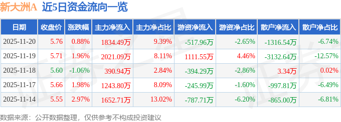 证券之星消息,截至2025年11月20日收盘,新大洲A(000571)报收于5.76元,上涨0.88%,换手率4.2%,成交量34.22万手,成交额1.95亿元。