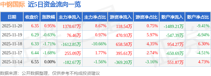 证券之星消息,截至2025年11月20日收盘,中钢国际(000928)报收于6.35元,上涨0.95%,换手率1.72%,成交量24.68万手,成交额1.58亿元。