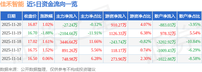证券之星消息,截至2025年11月20日收盘,佳禾智能(300793)报收于16.87元,上涨1.02%,换手率3.54%,成交量13.18万手,成交额2.24亿元。