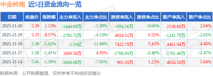 证券之星消息,截至2025年11月20日收盘,中金岭南(000060)报收于5.39元,上涨1.13%,换手率4.37%,成交量191.75万手,成交额10.5亿元。