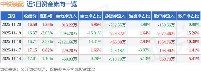 证券之星消息,截至2025年11月20日收盘,中铁装配(300374)报收于16.58元,上涨1.28%,换手率4.72%,成交量9.21万手,成交额1.53亿元。