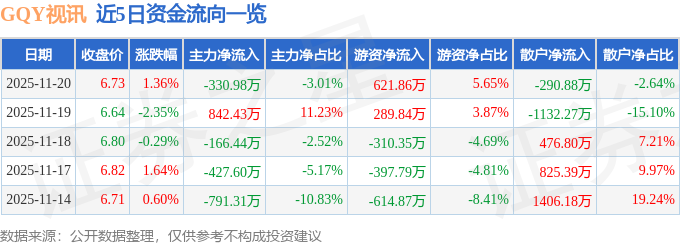 证券之星消息,截至2025年11月20日收盘,GQY视讯(300076)报收于6.73元,上涨1.36%,换手率3.88%,成交量16.45万手,成交额1.1亿元。
