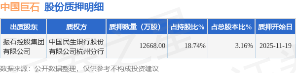 证券之星消息,中国巨石(600176)11月21日公开信息显示,股东振石控股集团有限公司向中国民生银行股份有限公司杭州分行合计质押1.27亿股,占总股本3.16%。质押详情见下表: