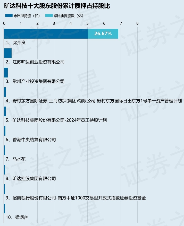 截止本公告日,股东沈介良已累计质押股份1.83亿股,占其持股总数的26.67%。本次质押后旷达科技十大股东的累计质押股份占持股比例(占持股比例的计算以公司最新一期财务报表公布的十大股东的持股总数为基准)见下图:
