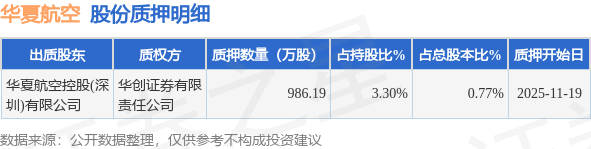 证券之星消息,华夏航空(002928)11月21日公开信息显示,股东华夏航空控股(深圳)有限公司向华创证券有限责任公司合计质押986.19万股,占总股本0.77%。质押详情见下表: