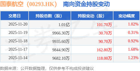 证券之星消息,11月20日南向资金增持101.7万股国泰航空(00293.HK)。近5个交易日中,获南向资金增持的有5天,累计净增持503.9万股。近20个交易日中,获南向资金增持的有17天,累计净增持1591.01万股。截至目前,南向资金持有国泰航空(00293.HK)1.01亿股,占公司已发行普通股的1.49%。