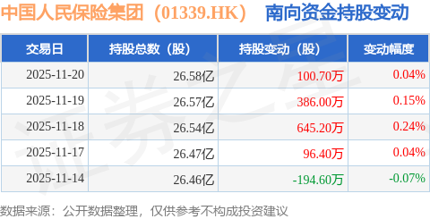 证券之星消息,11月20日南向资金增持100.7万股中国人民保险集团(01339.HK)。近5个交易日中,获南向资金增持的有4天,累计净增持1033.7万股。近20个交易日中,获南向资金减持的有10天,累计净减持1551.8万股。截至目前,南向资金持有中国人民保险集团(01339.HK)26.58亿股,占公司已发行普通股的30.45%。