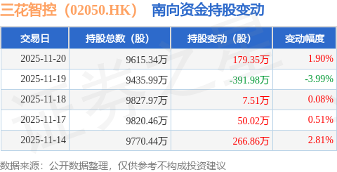 证券之星消息,11月20日南向资金增持179.35万股三花智控(02050.HK)。近5个交易日中,获南向资金增持的有4天,累计净增持111.76万股。近20个交易日中,获南向资金增持的有15天,累计净增持2671.65万股。截至目前,南向资金持有三花智控(02050.HK)9615.34万股,占公司已发行普通股的20.17%。