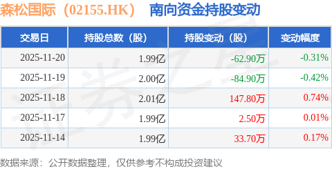 证券之星消息,11月20日南向资金减持62.9万股森松国际(02155.HK)。近5个交易日中,获南向资金增持的有3天,累计净增持36.2万股。近20个交易日中,获南向资金增持的有14天,累计净增持411.4万股。截至目前,南向资金持有森松国际(02155.HK)1.99亿股,占公司已发行普通股的16.0%。