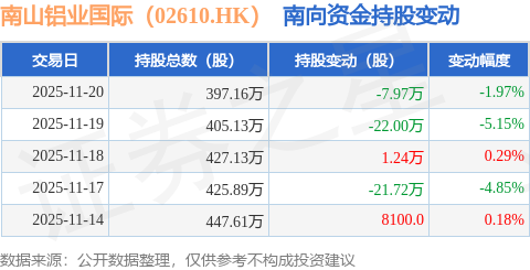 证券之星消息,11月20日南向资金减持7.97万股南山铝业国际(02610.HK)。近5个交易日中,获南向资金减持的有3天,累计净减持49.64万股。近20个交易日中,获南向资金增持的有11天,累计净增持133.02万股。截至目前,南向资金持有南山铝业国际(02610.HK)397.16万股,占公司已发行普通股的0.66%。