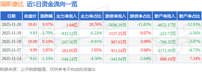证券之星消息,截至2025年11月20日收盘,瑞斯康达(603803)报收于10.81元,上涨9.97%,涨停,换手率8.23%,成交量34.97万手,成交额3.6亿元。