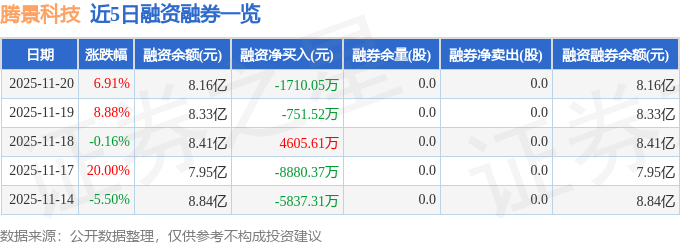 腾景科技融资融券信息显示,融资方面,当日融资买入3.13亿元,融资偿还3.3亿元,融资净偿还1710.05万元。融券方面,融券卖出0.0股,融券偿还0.0股,融券余量0.0股,融券余额0.0万元。融资融券余额8.16亿元。