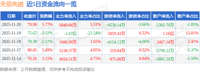 证券之星消息,截至2025年11月20日收盘,天岳先进(688234)报收于79.98元,上涨5.77%,换手率3.59%,成交量15.44万手,成交额12.42亿元。