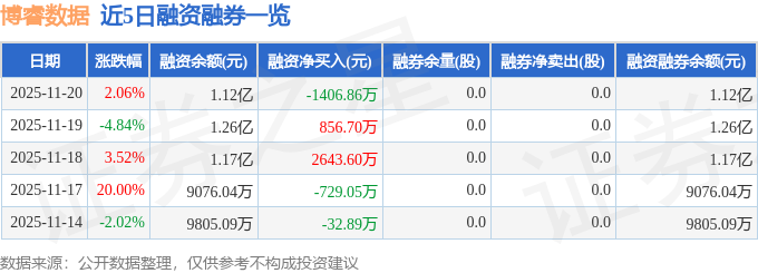 博睿数据融资融券信息显示,融资方面,当日融资买入3040.23万元,融资偿还4447.09万元,融资净偿还1406.86万元。融券方面,融券卖出0.0股,融券偿还0.0股,融券余量0.0股,融券余额0.0万元。融资融券余额1.12亿元。