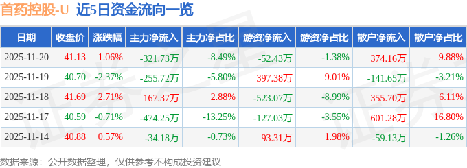 证券之星消息,截至2025年11月20日收盘,首药控股(688197)报收于41.13元,上涨1.06%,换手率1.44%,成交量9230.0手,成交额3787.99万元。