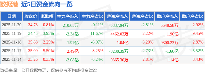证券之星消息,截至2025年11月20日收盘,数据港(603881)报收于34.73元,上涨0.81%,换手率7.68%,成交量55.14万手,成交额19.0亿元。