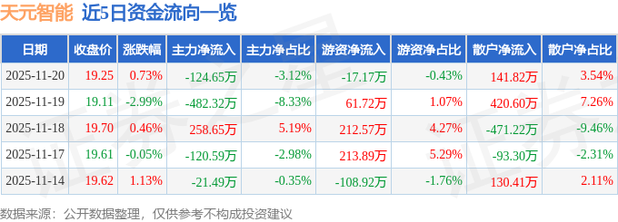 证券之星消息,截至2025年11月20日收盘,天元智能(603273)报收于19.25元,上涨0.73%,换手率3.73%,成交量2.09万手,成交额4001.02万元。