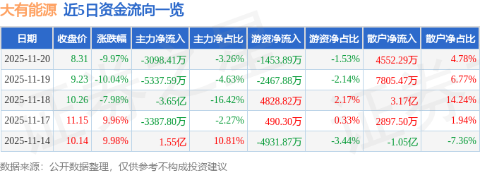 证券之星消息,截至2025年11月20日收盘,大有能源(600403)报收于8.31元,下跌9.97%,换手率4.64%,成交量110.84万手,成交额9.52亿元。