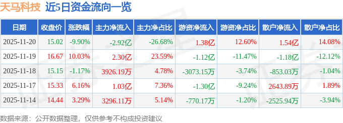 证券之星消息,截至2025年11月20日收盘,天马科技(603668)报收于15.02元,下跌9.9%,换手率14.14%,成交量71.19万手,成交额10.94亿元。