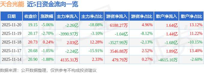 证券之星消息,截至2025年11月20日收盘,天合光能(688599)报收于19.15元,下跌5.06%,换手率2.93%,成交量63.89万手,成交额12.47亿元。