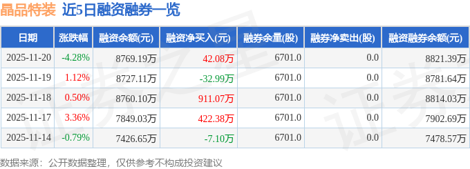 晶品特装融资融券信息显示,融资方面,当日融资买入456.94万元,融资偿还414.86万元,融资净买入42.08万元。融券方面,融券卖出0.0股,融券偿还0.0股,融券余量6701.0股,融券余额52.2万元。融资融券余额8821.39万元。