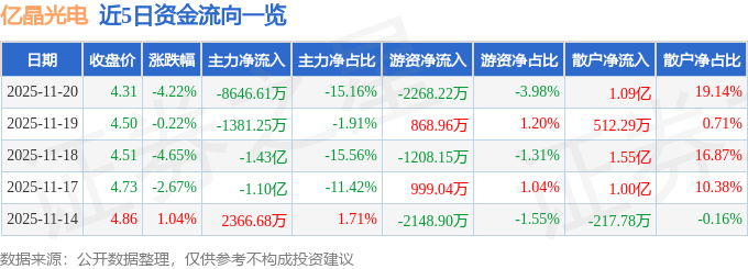 证券之星消息,截至2025年11月20日收盘,亿晶光电(600537)报收于4.31元,下跌4.22%,换手率11.0%,成交量130.19万手,成交额5.7亿元。