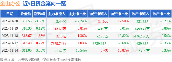 证券之星消息,截至2025年11月20日收盘,金山办公(688111)报收于307.55元,下跌3.38%,换手率1.38%,成交量6.39万手,成交额19.94亿元。