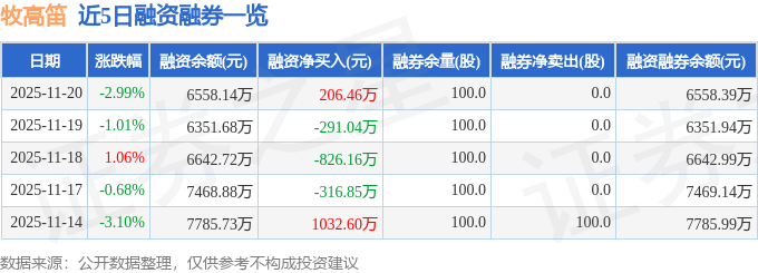 牧高笛融资融券信息显示,融资方面,当日融资买入1075.79万元,融资偿还869.33万元,融资净买入206.46万元。融券方面,融券卖出0.0股,融券偿还0.0股,融券余量100.0股,融券余额0.26万元。融资融券余额6558.39万元。