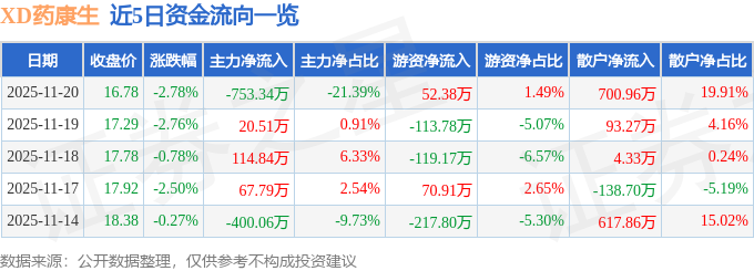 证券之星消息,截至2025年11月20日收盘,XD药康生(688046)报收于16.78元,下跌2.78%,换手率0.51%,成交量2.07万手,成交额3521.34万元。