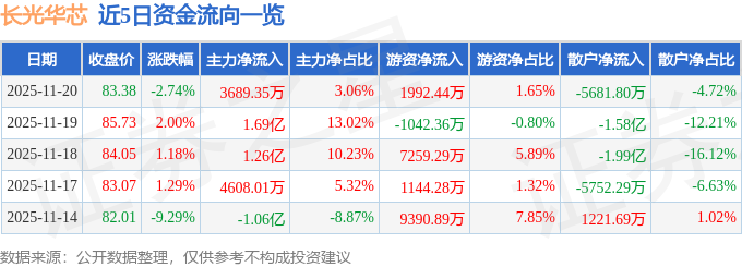 11月20日的资金流向数据方面,主力资金净流入3689.35万元,占总成交额3.06%,游资资金净流入1992.44万元,占总成交额1.65%,散户资金净流出5681.8万元,占总成交额4.72%。