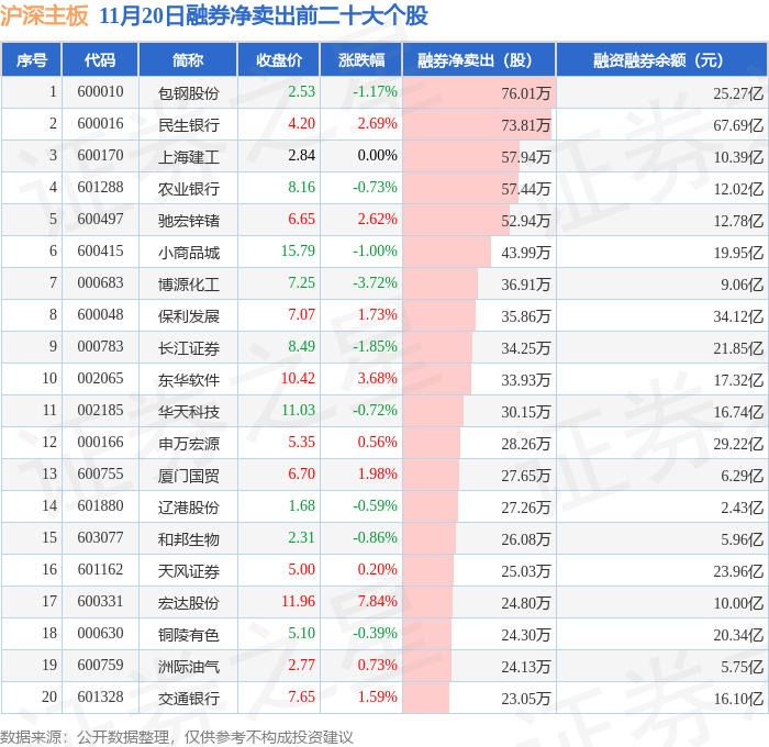 沪深主板融券净卖出前三分别为:包钢股份(600010)融券净卖出76.01万股、民生银行(600016)融券净卖出73.81万股、上海建工(600170)融券净卖出57.94万股,前20具体见下表: