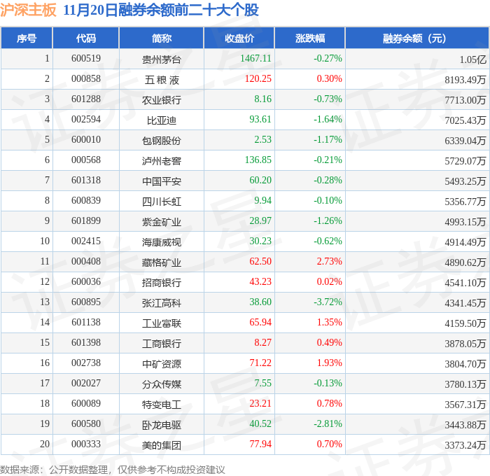 沪深主板融券余额前三分别为:贵州茅台(600519)融券余额1.05亿元、五 粮 液(000858)融券余额8193.49万元、农业银行(601288)融券余额7713万元,前20具体见下表: