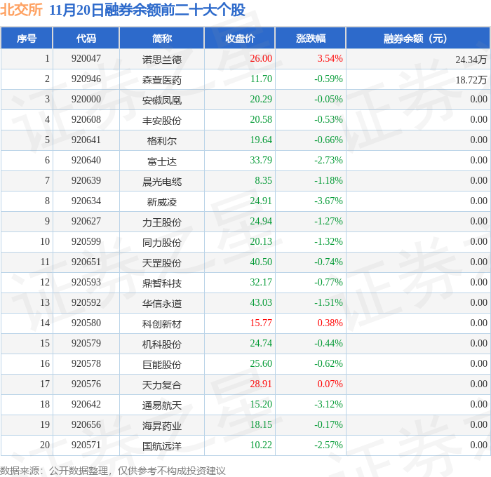 北交所融券余额前三分别为:诺思兰德(920047)融券余额24.34万元、森萱医药(920946)融券余额18.72万元,前20具体见下表: