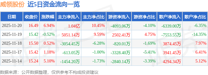 证券之星消息,截至2025年11月20日收盘,威领股份(002667)报收于16.49元,上涨6.94%,换手率25.47%,成交量60.27万手,成交额9.98亿元。