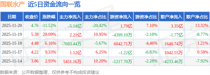 证券之星消息,截至2025年11月20日收盘,国联水产(300094)报收于4.76元,下跌11.52%,换手率43.66%,成交量482.63万手,成交额25.16亿元。